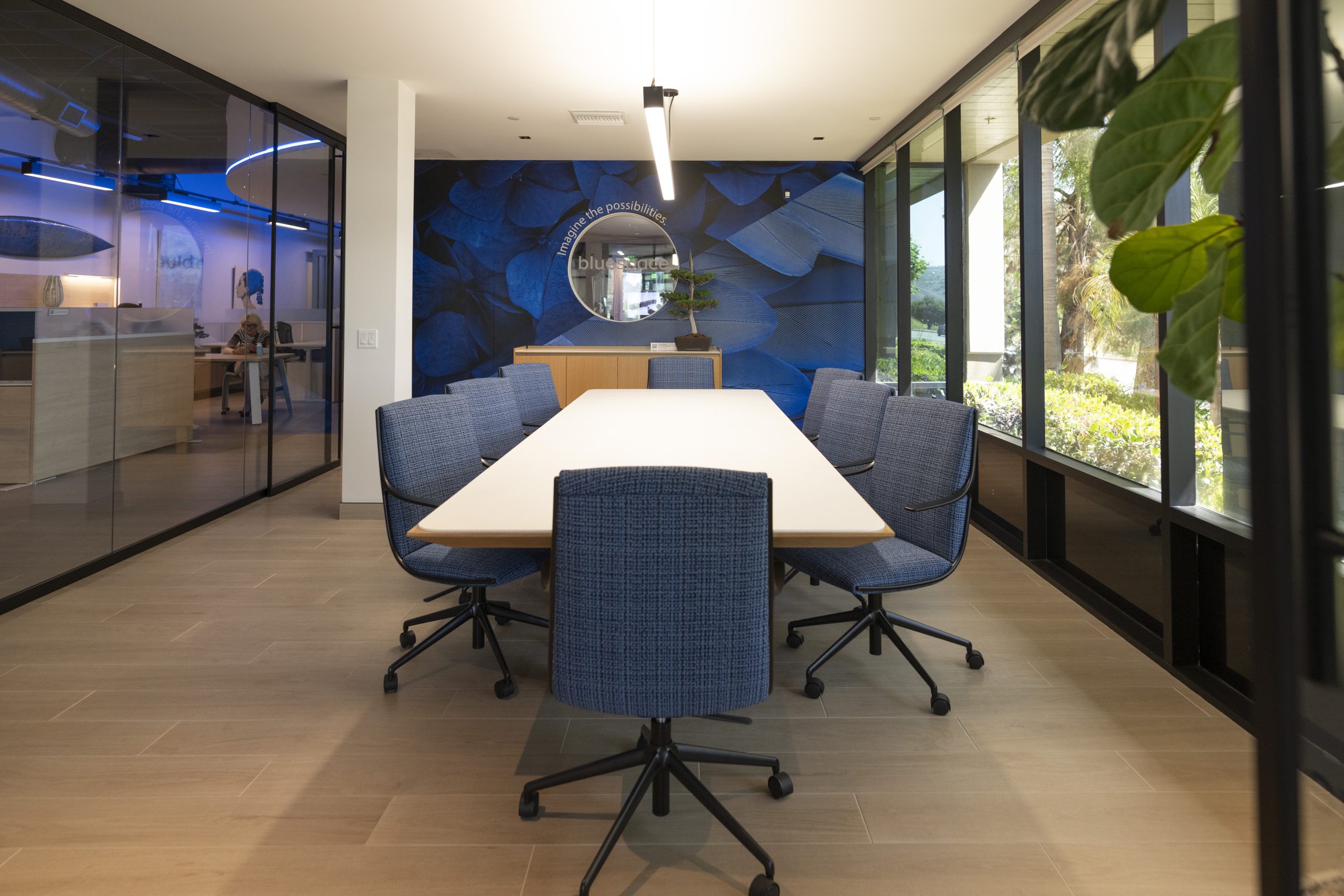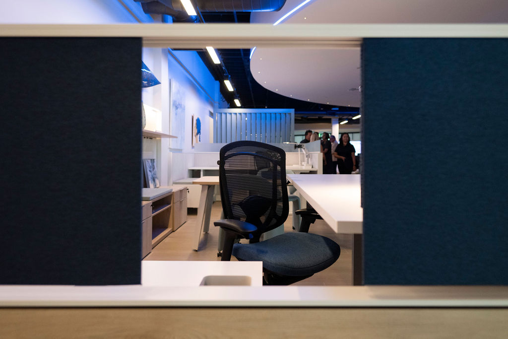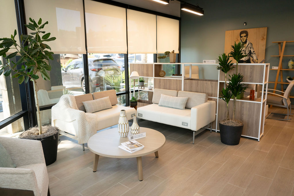 A showroom for high-end office furniture and lighting design: this interior renovation merged the worlds of commercial retail space and reso-mercial trends. Designed exclusively by Brian Rivera Studio in Yorba Linda, California using the views of the mountains as influence for the slopes and forms of the architecture.